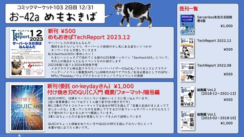 コミックマーケット103(2023冬コミ)に参加します。 おしながき 新刊:TechReport 2023.12 500円 めもおきばTechReport 2023.12 今回は3つの記事でお送りします。 【サーバーレスの次はなんなんだ】現状をおさらいしつつ、サーバーレス技術の少し先にある姿…